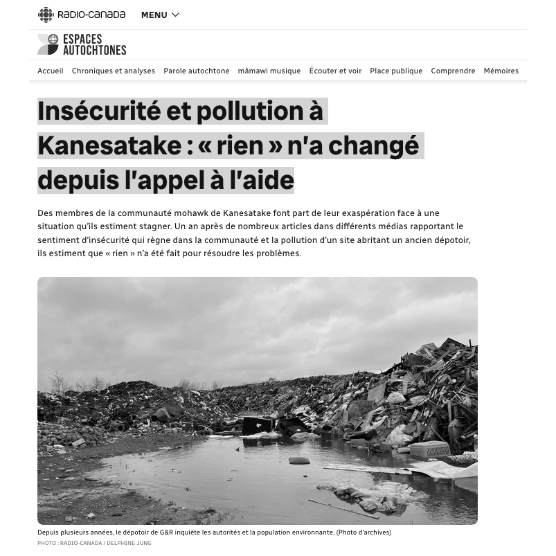 « Des membres de la communauté mohawk de Kanesatake font part de leur exaspération face à une situation qu’ils estiment stagner. Un an après de nombreux articles dans différents médias rapportant le sentiment d’insécurité qui règne dans la communauté et la pollution d’un site abritant un ancien dépotoir, ils estiment que « rien » n’a été fait pour résoudre les problèmes. »